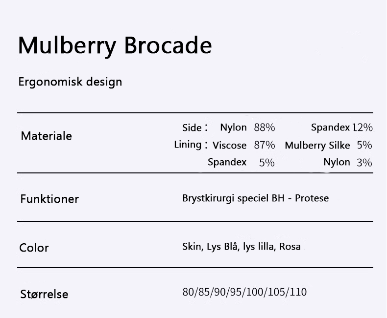 En smuk BH til brystopererede kvinder som har alt det du har behov for til en behagelig hverdag. En BH med eksklusiv, smuk mulberry silke brokade blonde ovenpå det elastiske satinstof, som føles behageligt og blødt på huden. En bh, der kan bruges selvom du ikke har fået foretaget en brystoperation og har brug for komfort og god støtte til barmen.
